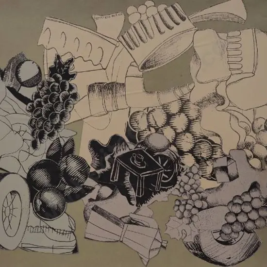 BROWN, Peter (1921-2005) - Still Life with Jugs, Bottle and Fruit Estimate: $600 - $900